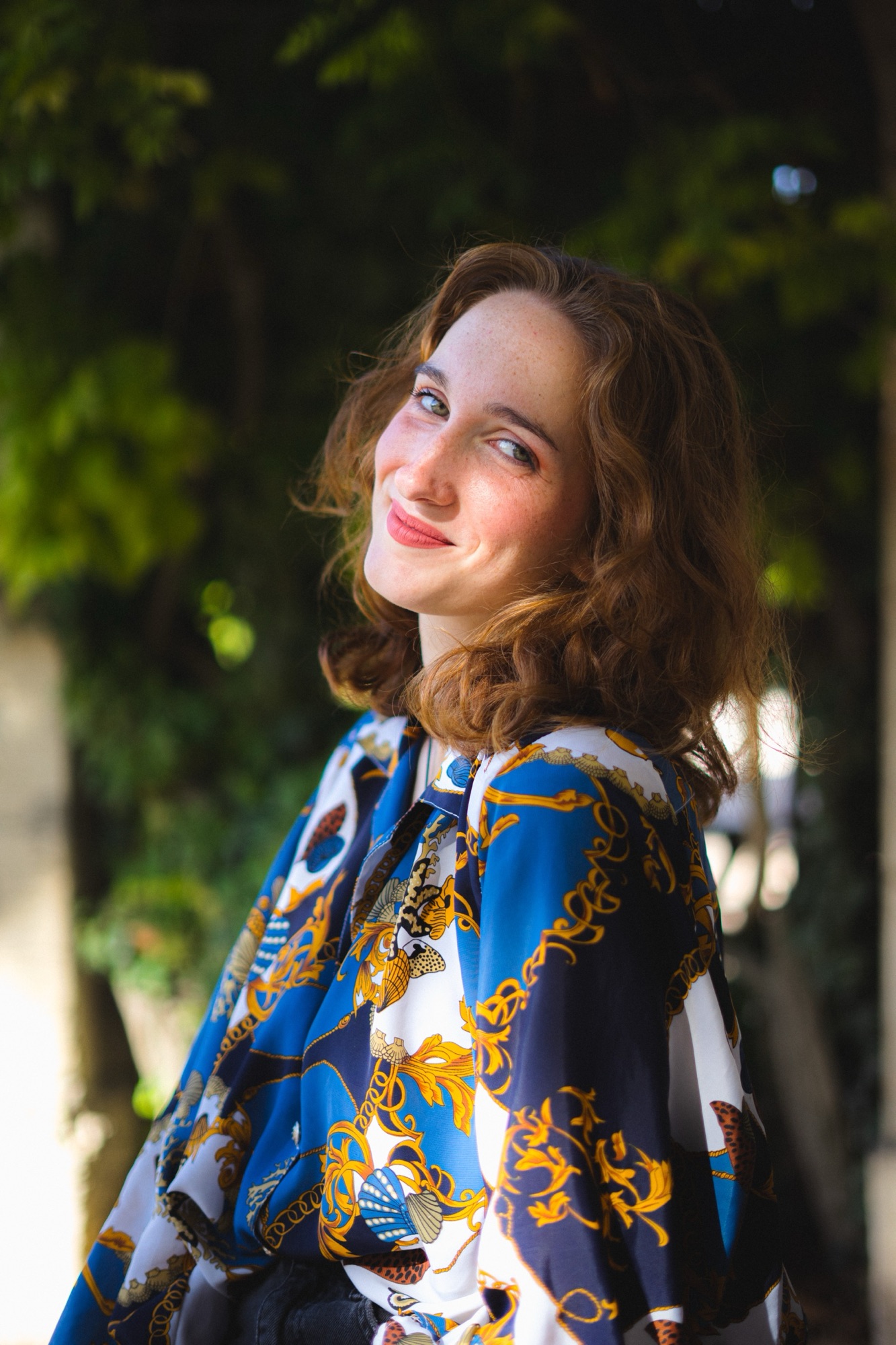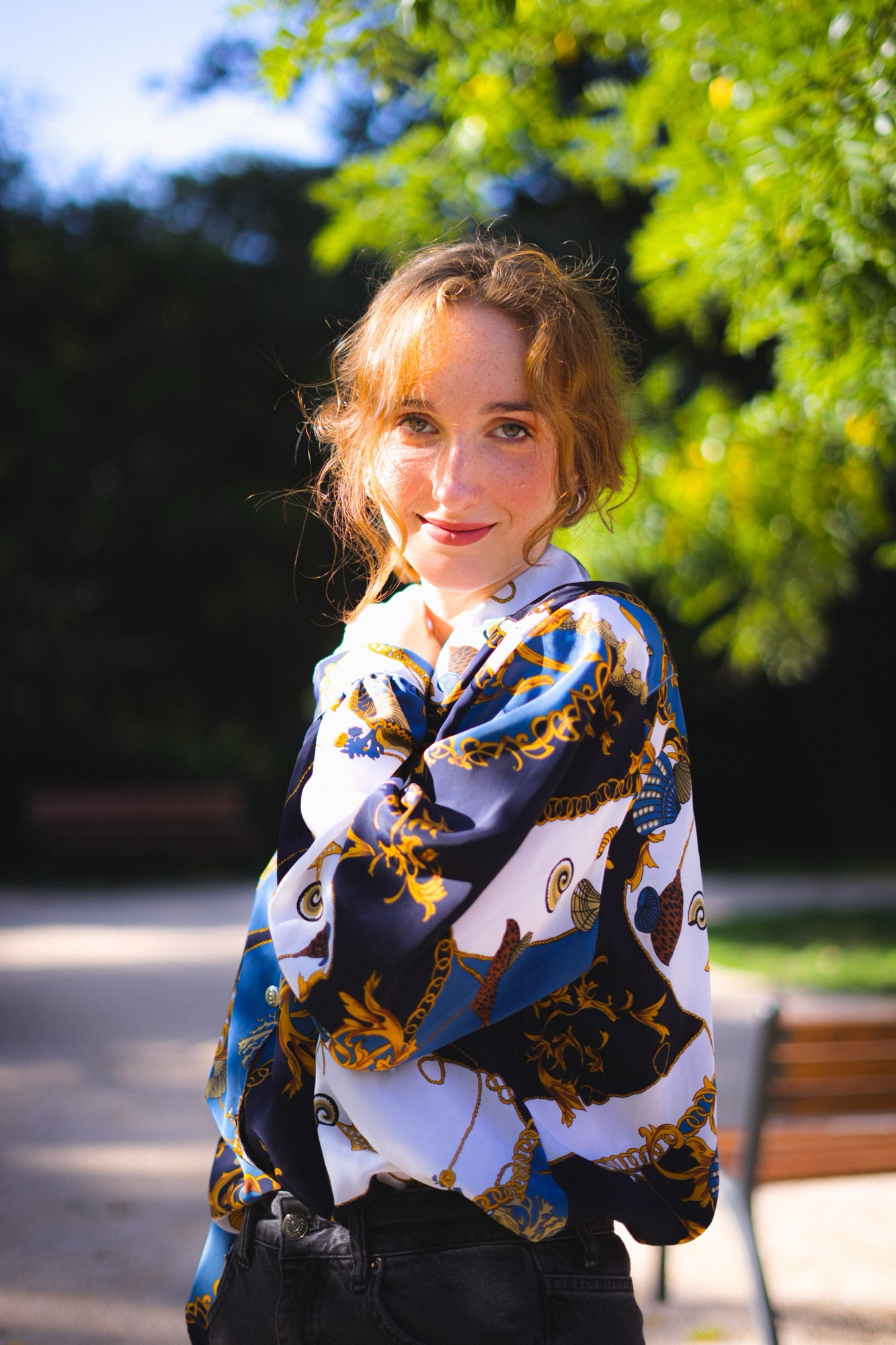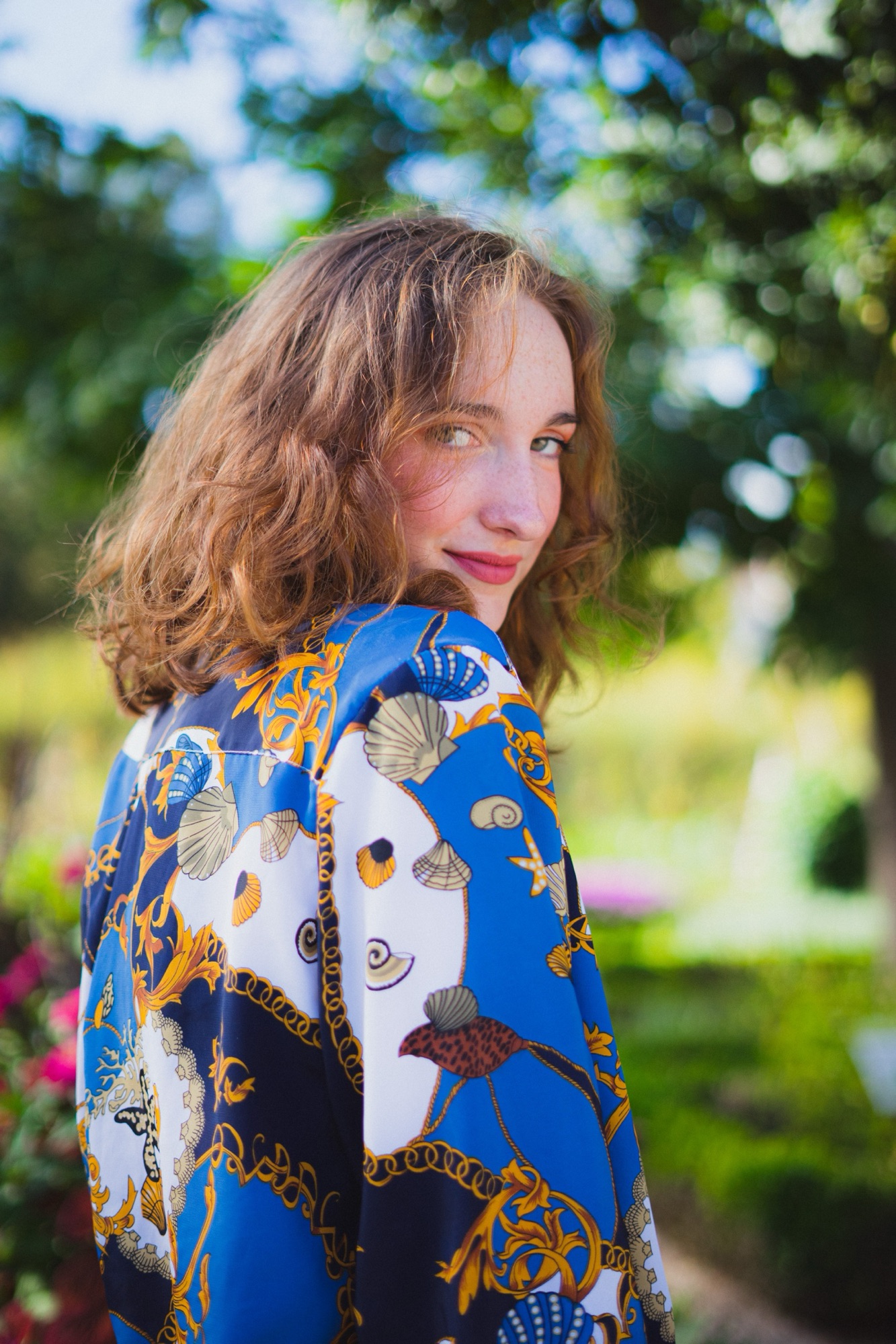 Un sourire mi-voilé par l’ombre d’une feuille, l’éclat d’un regard baigné dans la douceur du jour, chaque cliché est une toile peinte avec les pinceaux de la lumière naturelle et les pigments d’un moment volé au temps. Là, drapée dans l’étoffe d’un bleu royal, parsemée de motifs qui racontent des légendes anciennes et des voyages imaginaires, elle se tient entre rêve et réalité, un pied dans chaque monde. Le vent joue dans ses boucles comme les notes d’une mélodie oubliée, rappelant que chaque seconde est une mélodie, chaque frémissement une note clé dans la symphonie de la vie.