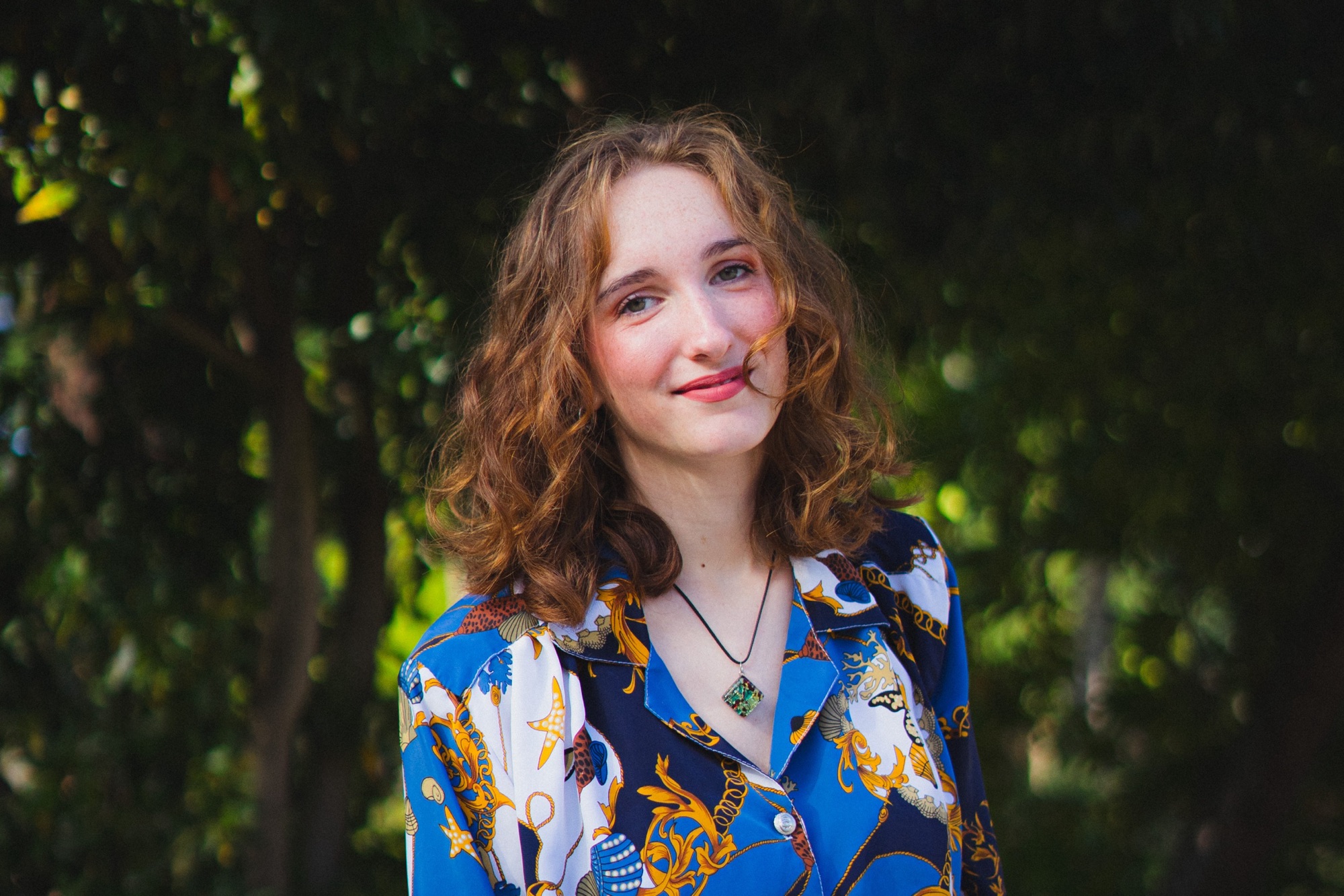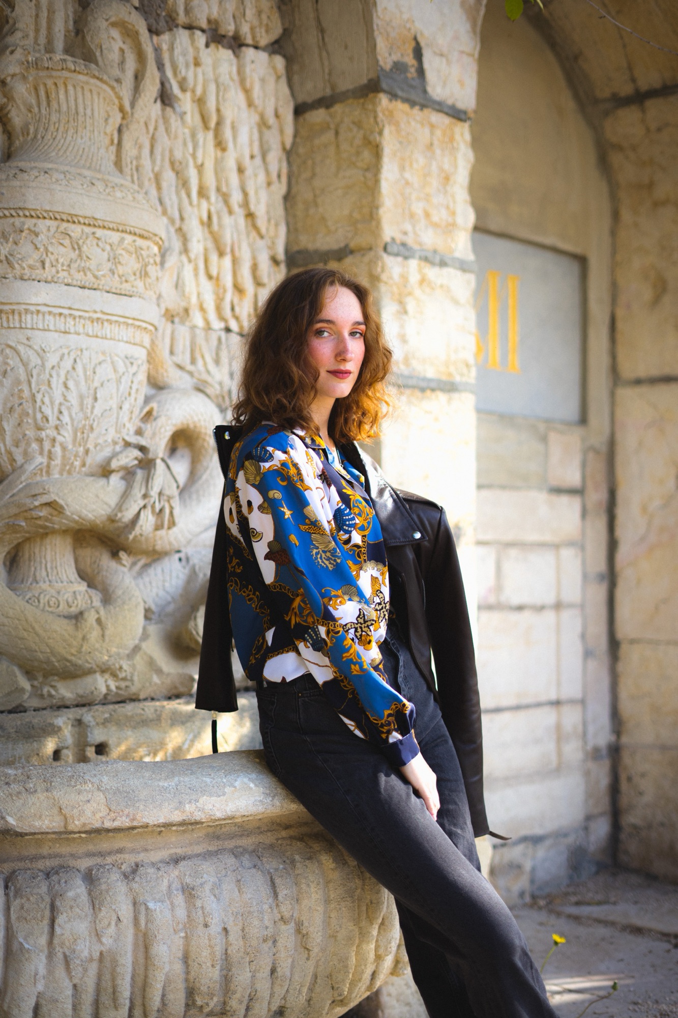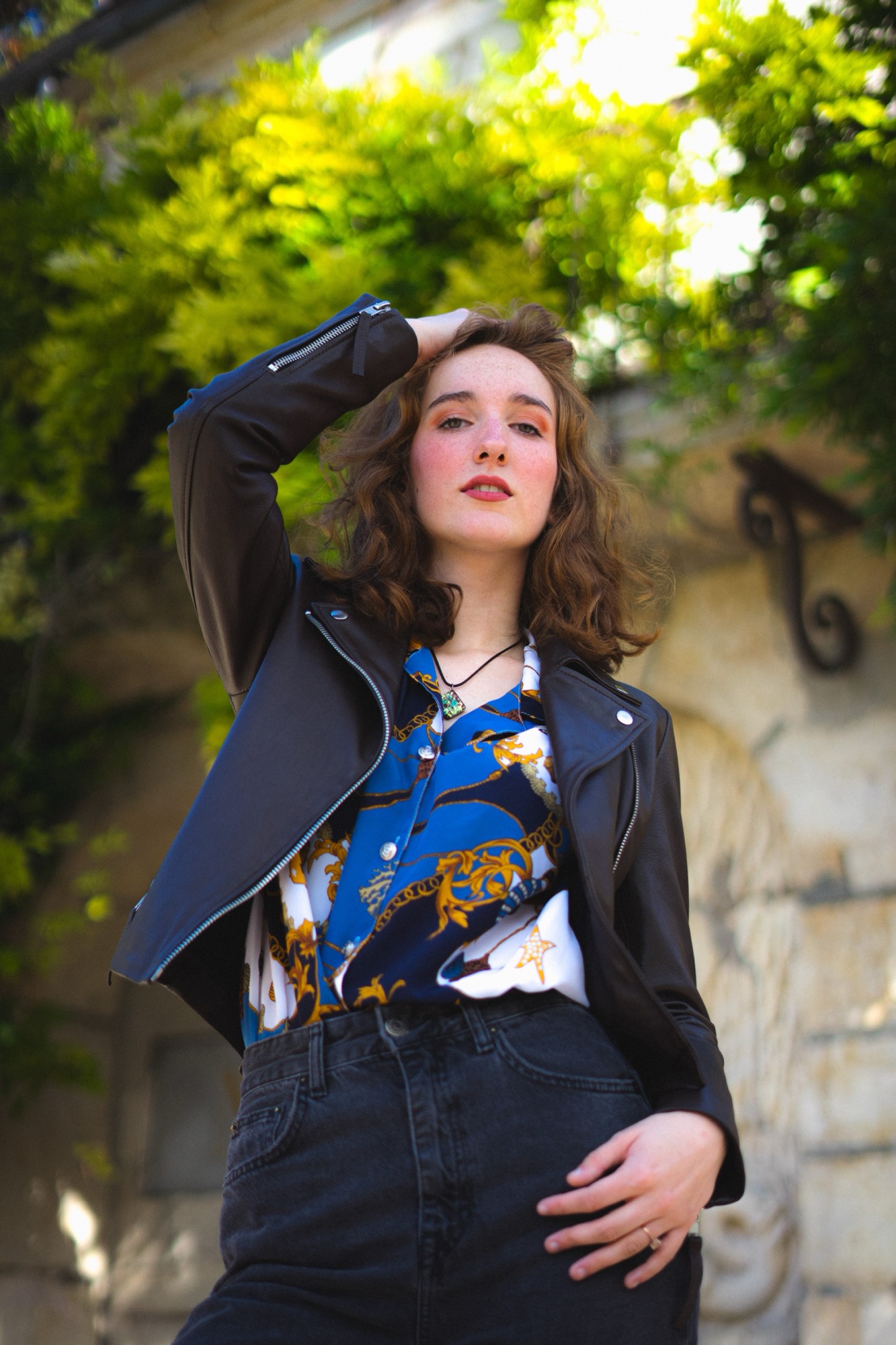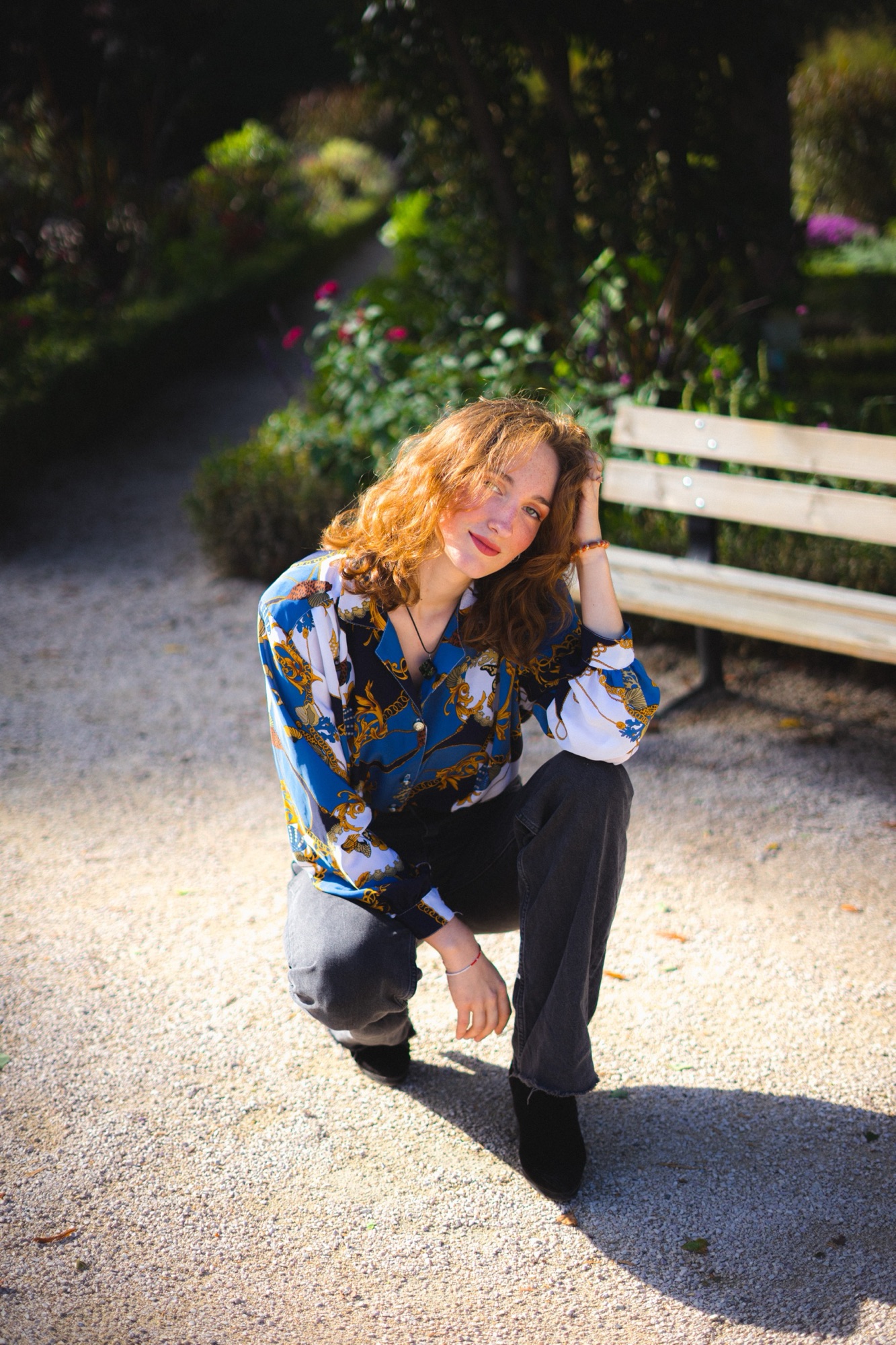 Un sourire mi-voilé par l’ombre d’une feuille, l’éclat d’un regard baigné dans la douceur du jour, chaque cliché est une toile peinte avec les pinceaux de la lumière naturelle et les pigments d’un moment volé au temps. Là, drapée dans l’étoffe d’un bleu royal, parsemée de motifs qui racontent des légendes anciennes et des voyages imaginaires, elle se tient entre rêve et réalité, un pied dans chaque monde. Le vent joue dans ses boucles comme les notes d’une mélodie oubliée, rappelant que chaque seconde est une mélodie, chaque frémissement une note clé dans la symphonie de la vie.