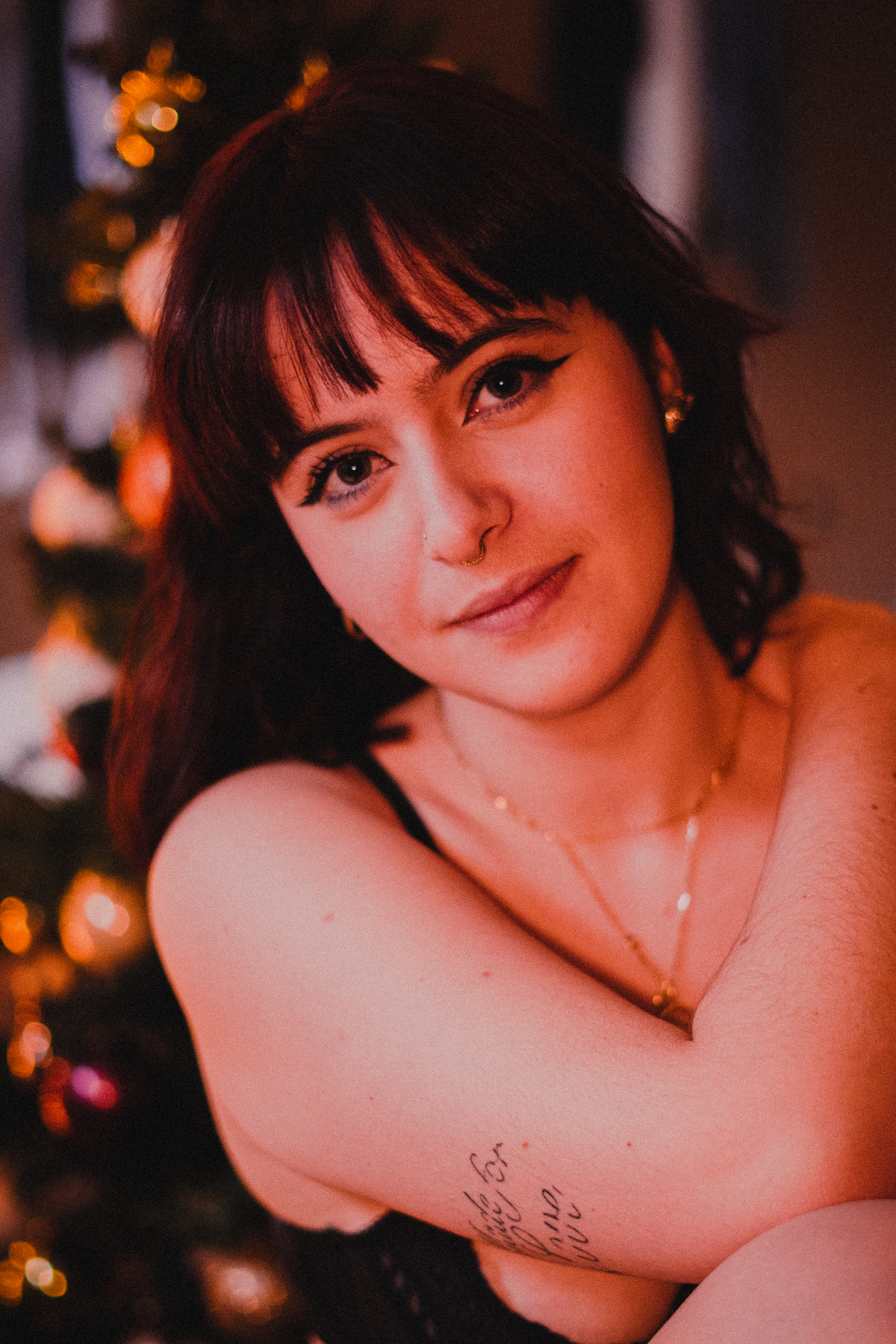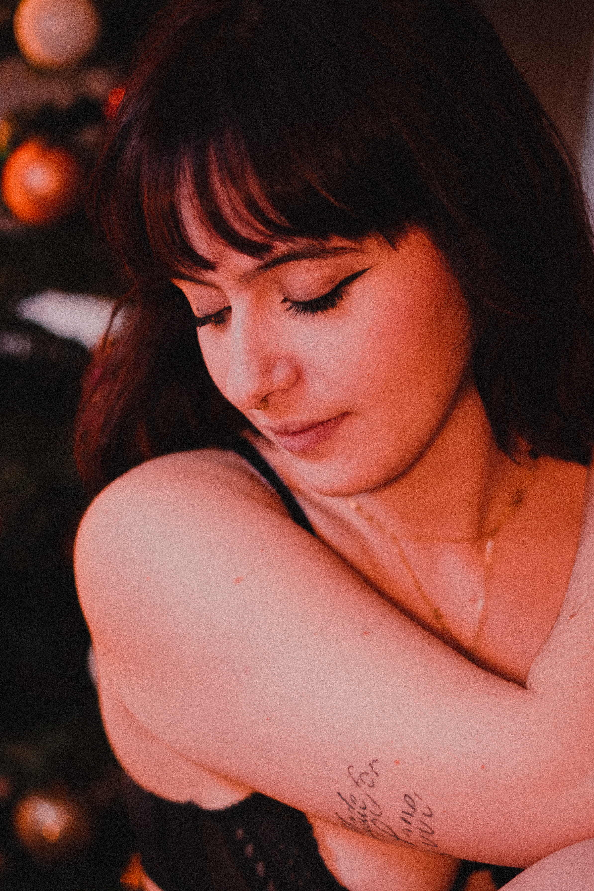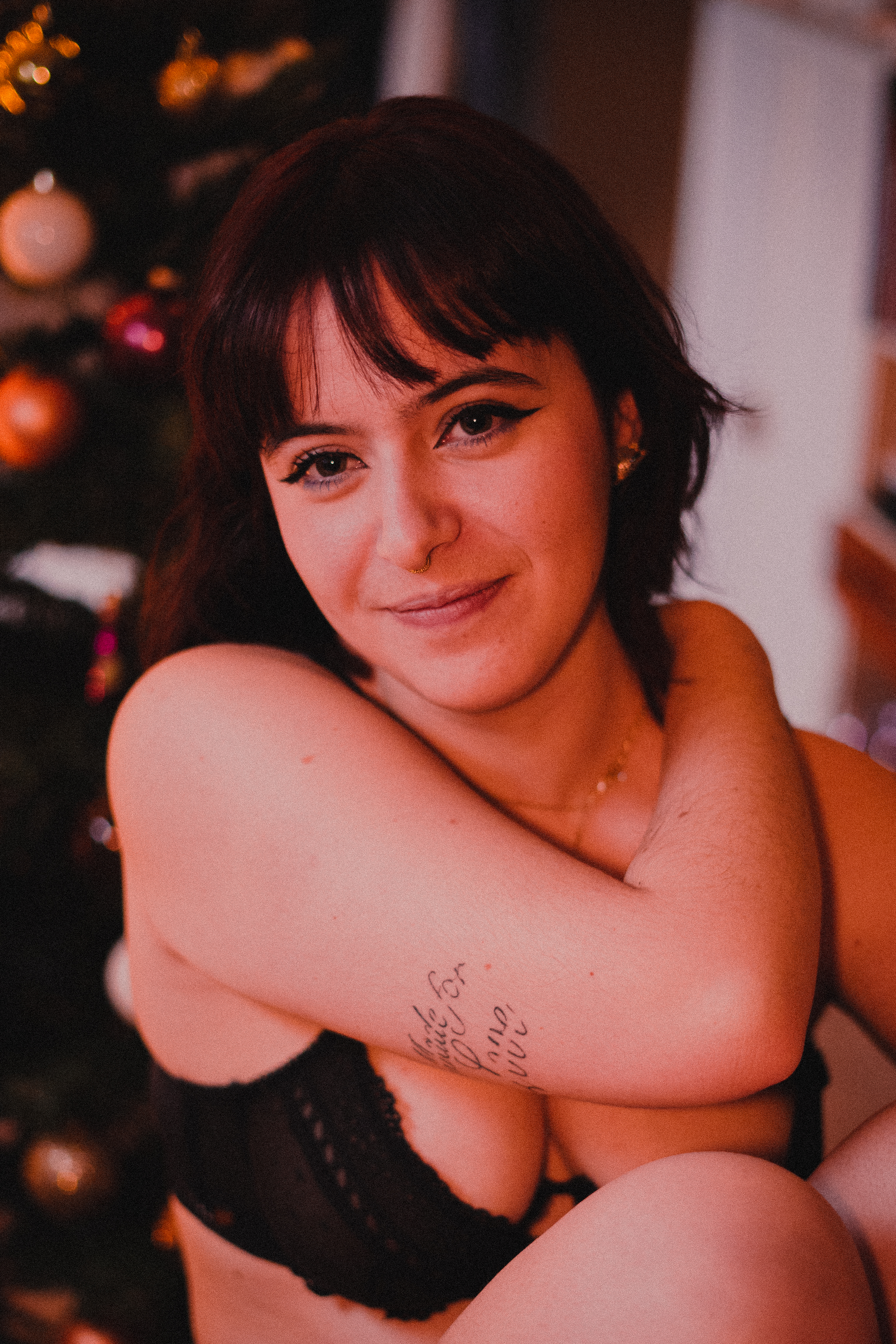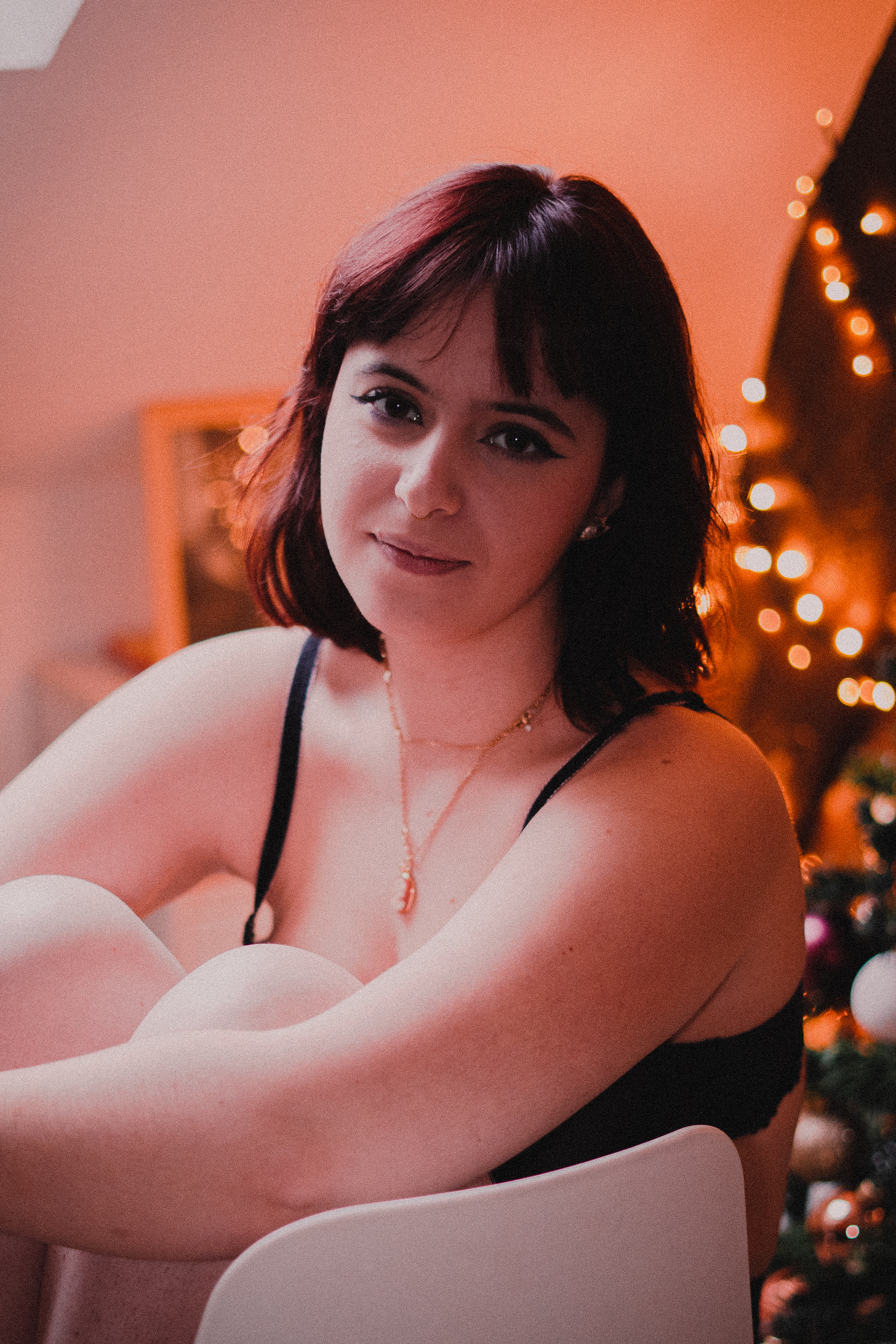 Dans l’écrin d’une soirée où la lumière se fait douce et les pensées s’envolent, je capture ces instants éphémères qui, ensemble, tissent le fil de mon histoire personnelle. Un sourire en demi-teinte, reflet de l’intimité d’un moment suspendu dans le temps, où les ombres dansent avec la lumière pour créer une harmonie parfaite. Une étreinte auto-proclamée, où l’on se blottit dans l’embrasse de son propre confort, là où les murmures du cœur se font écho à travers le silence de la pièce. Et finalement, un regard qui se pose, non pas sur ce qui est visible, mais sur ce qui est ressenti, l’invisible beauté de l’âme qui se révèle dans un cadre festif.