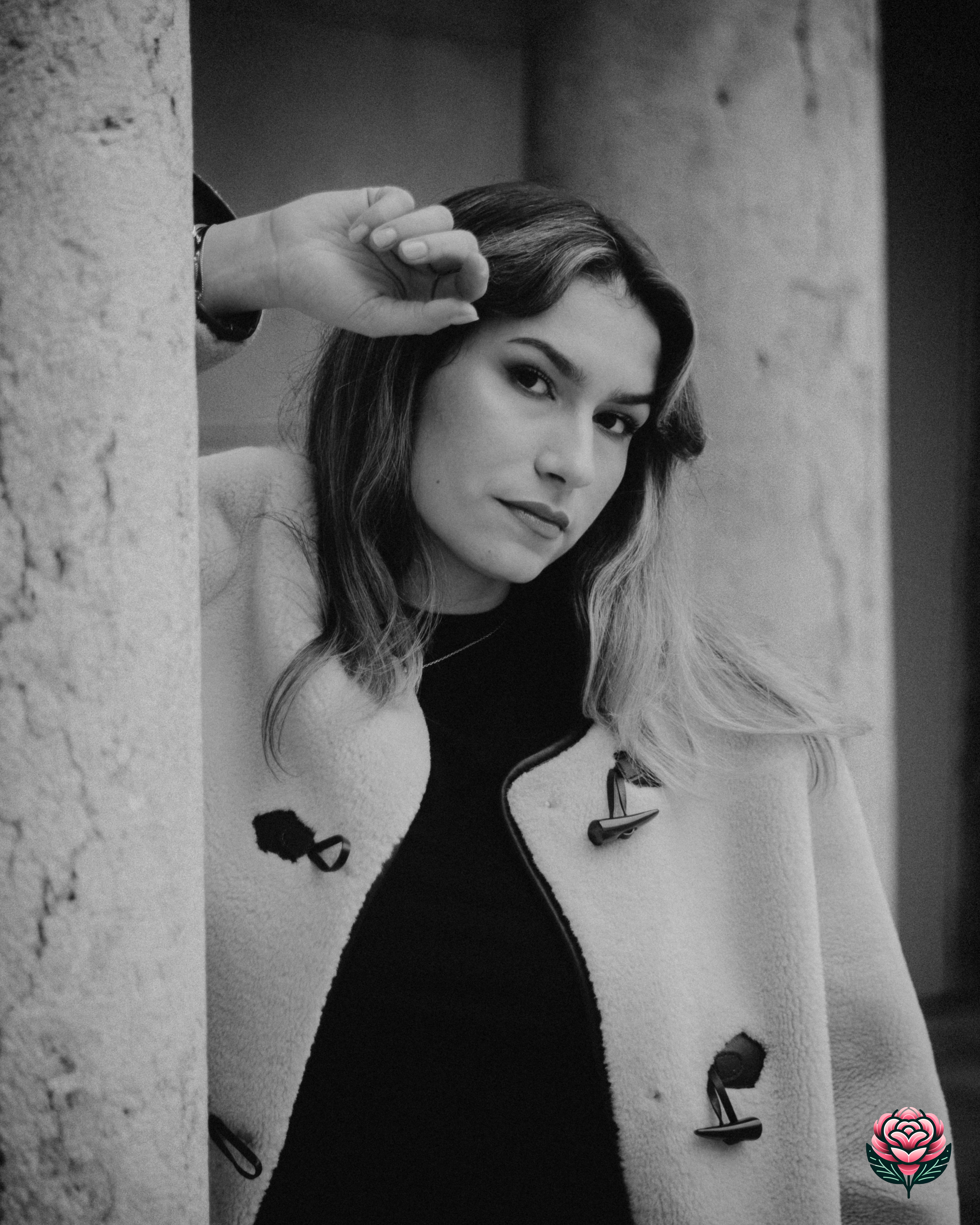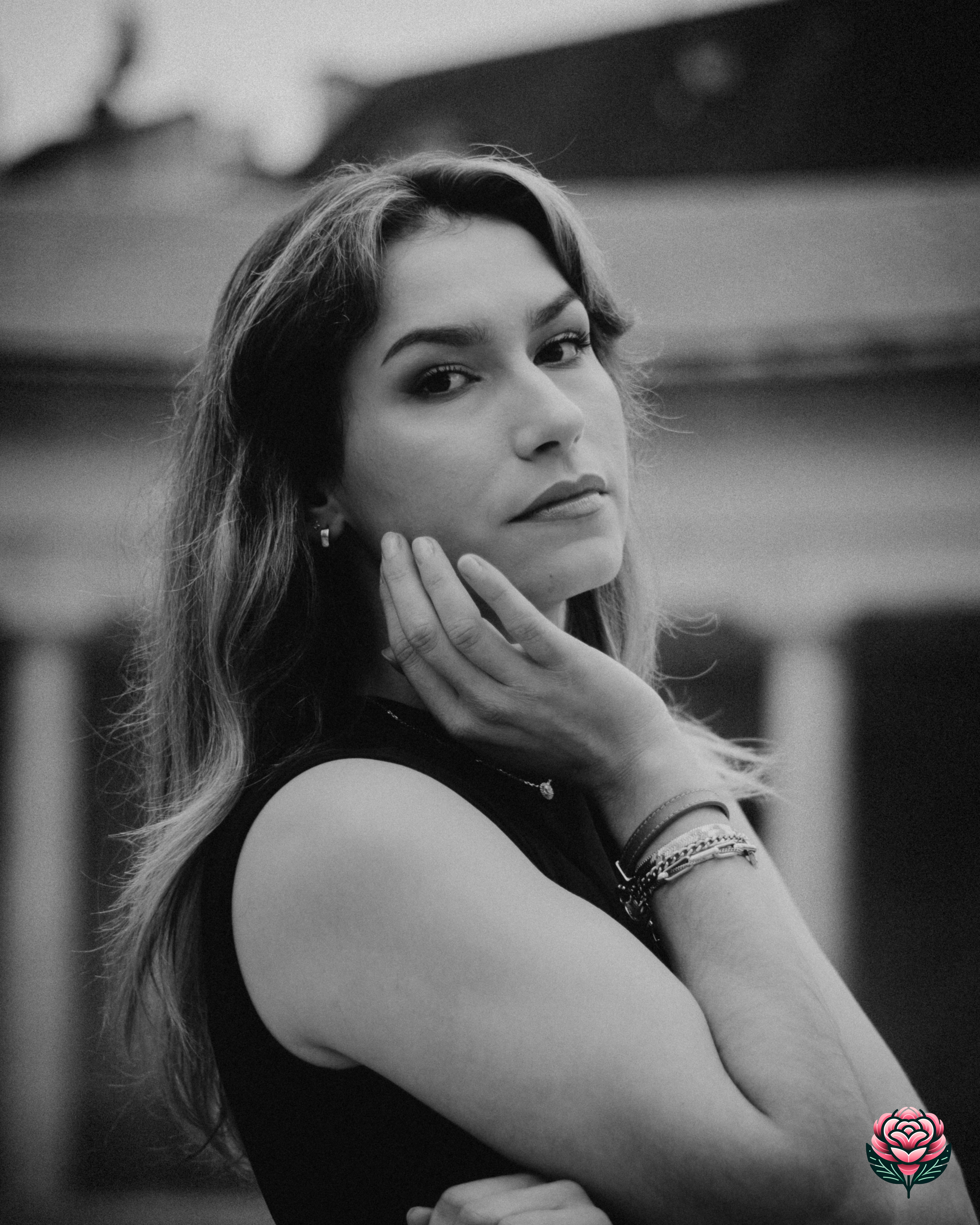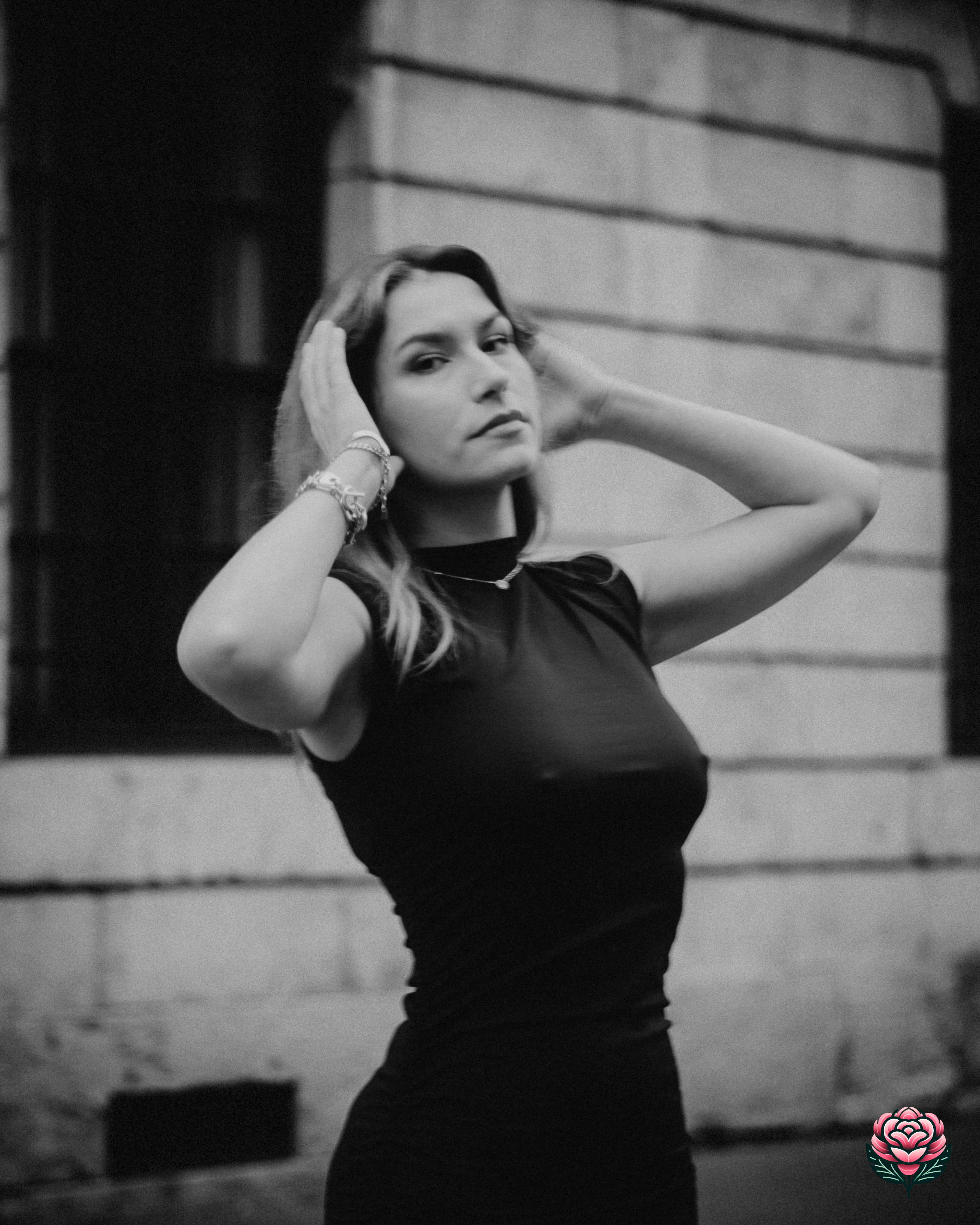 Sous les arches silencieuses, elle avance avec une grâce presque irréelle, se fondant dans le dialogue du temps. Chaque pas résonne à peine sur la pierre ancienne, témoignant d’un passé figé dans la mémoire des lieux. La lumière s’insinue avec délicatesse, caressant les ombres étirées sur les colonnes séculaires, révélant dans ce clair-obscur une élégance qui transcende les époques.