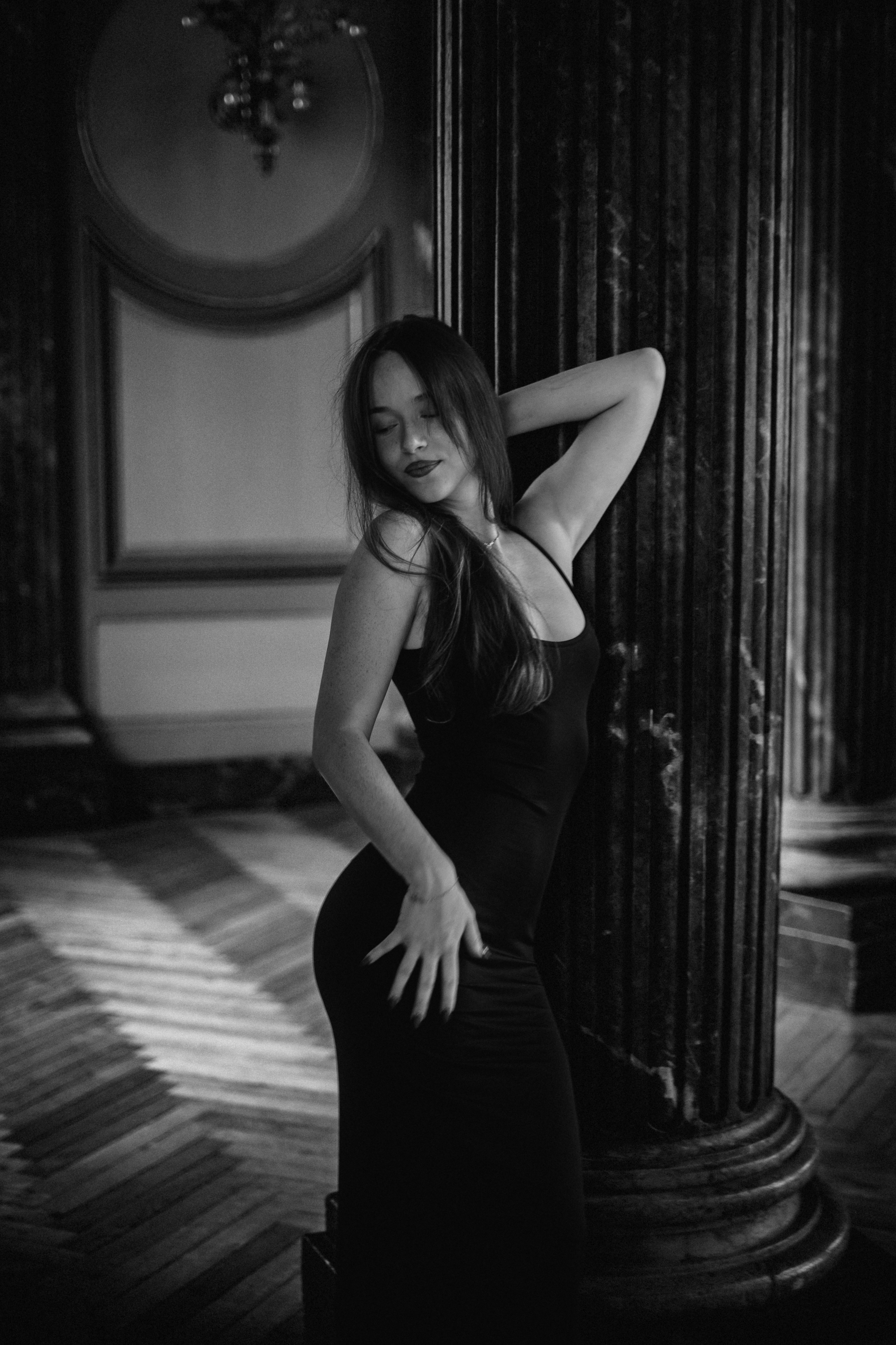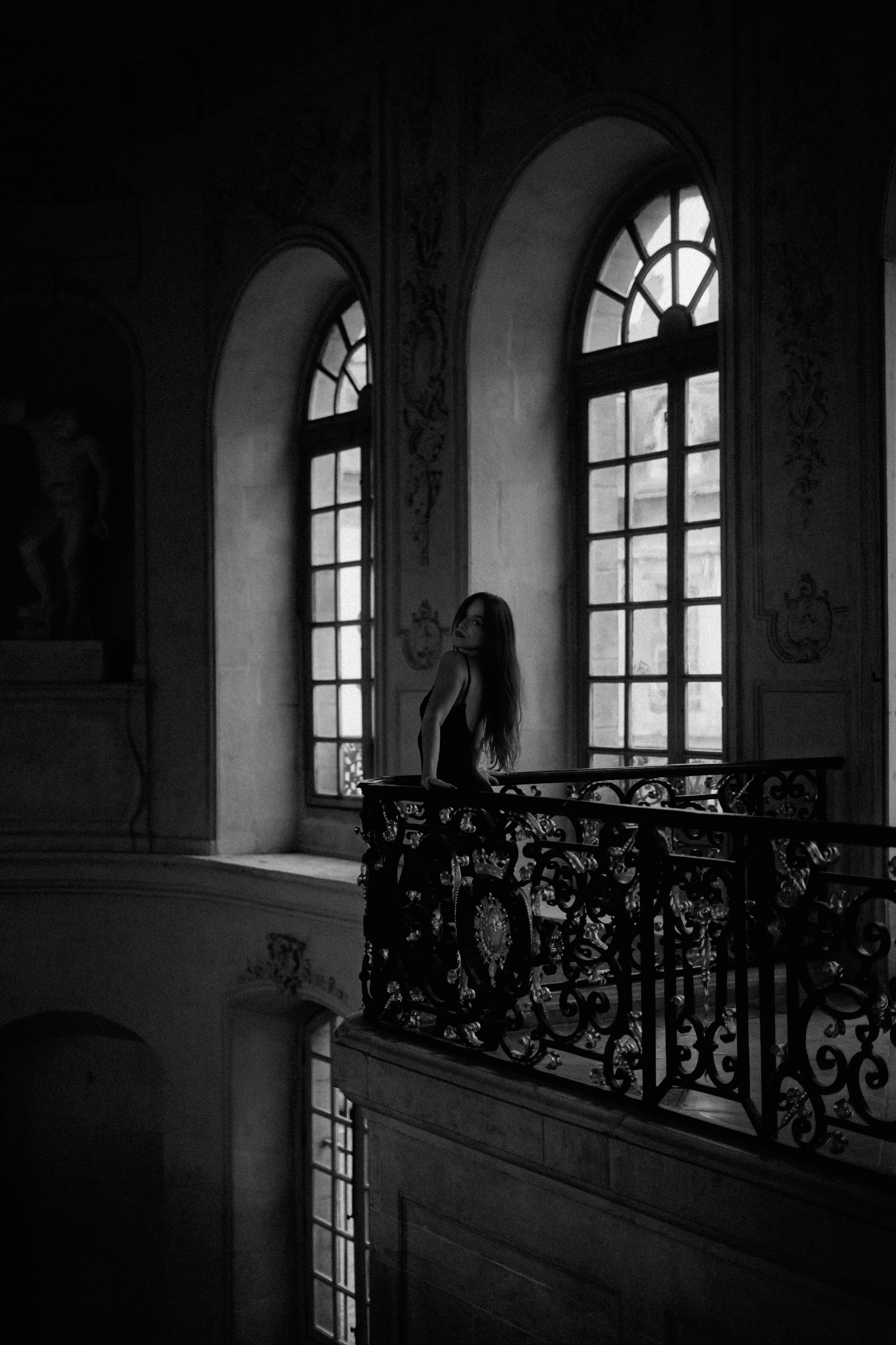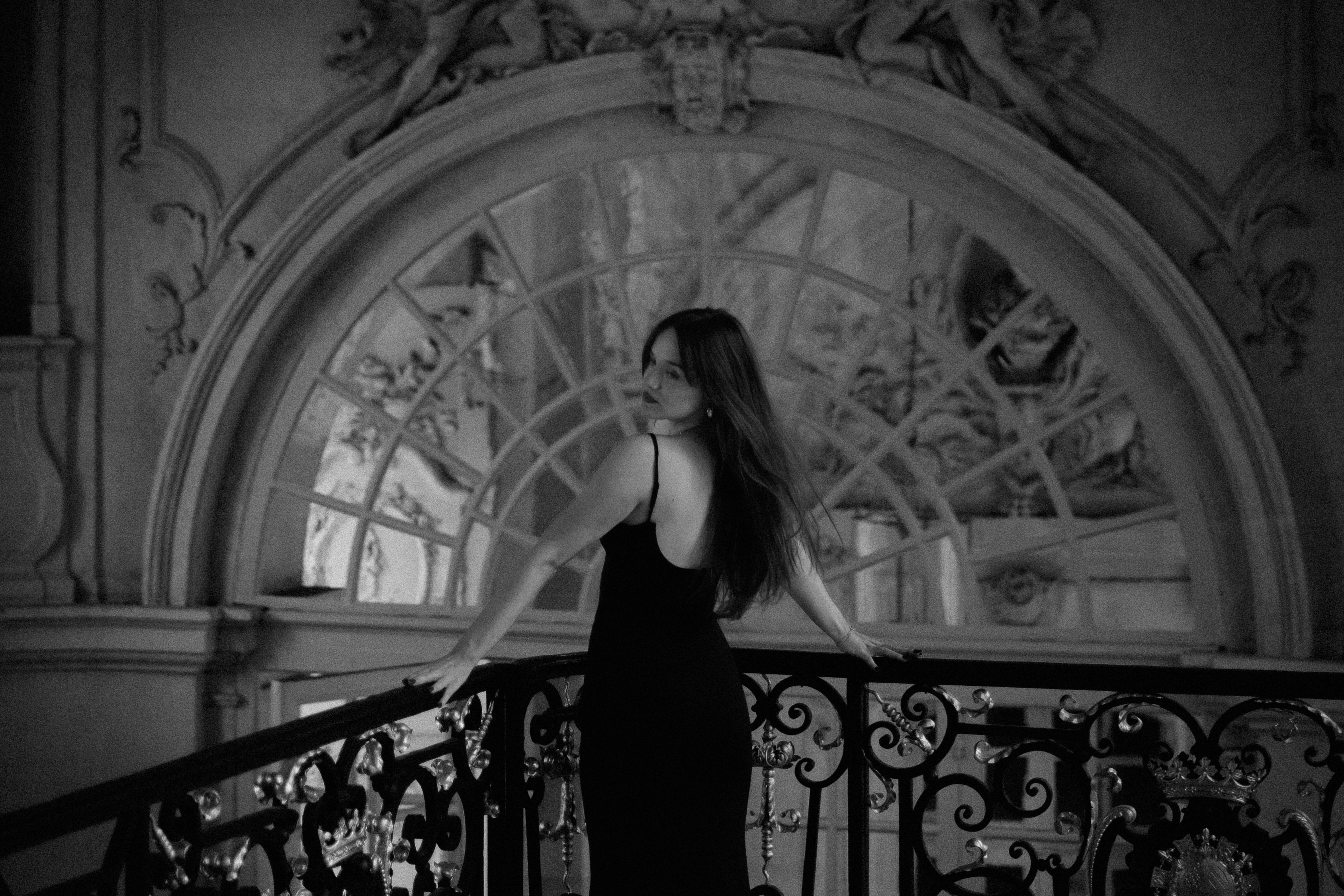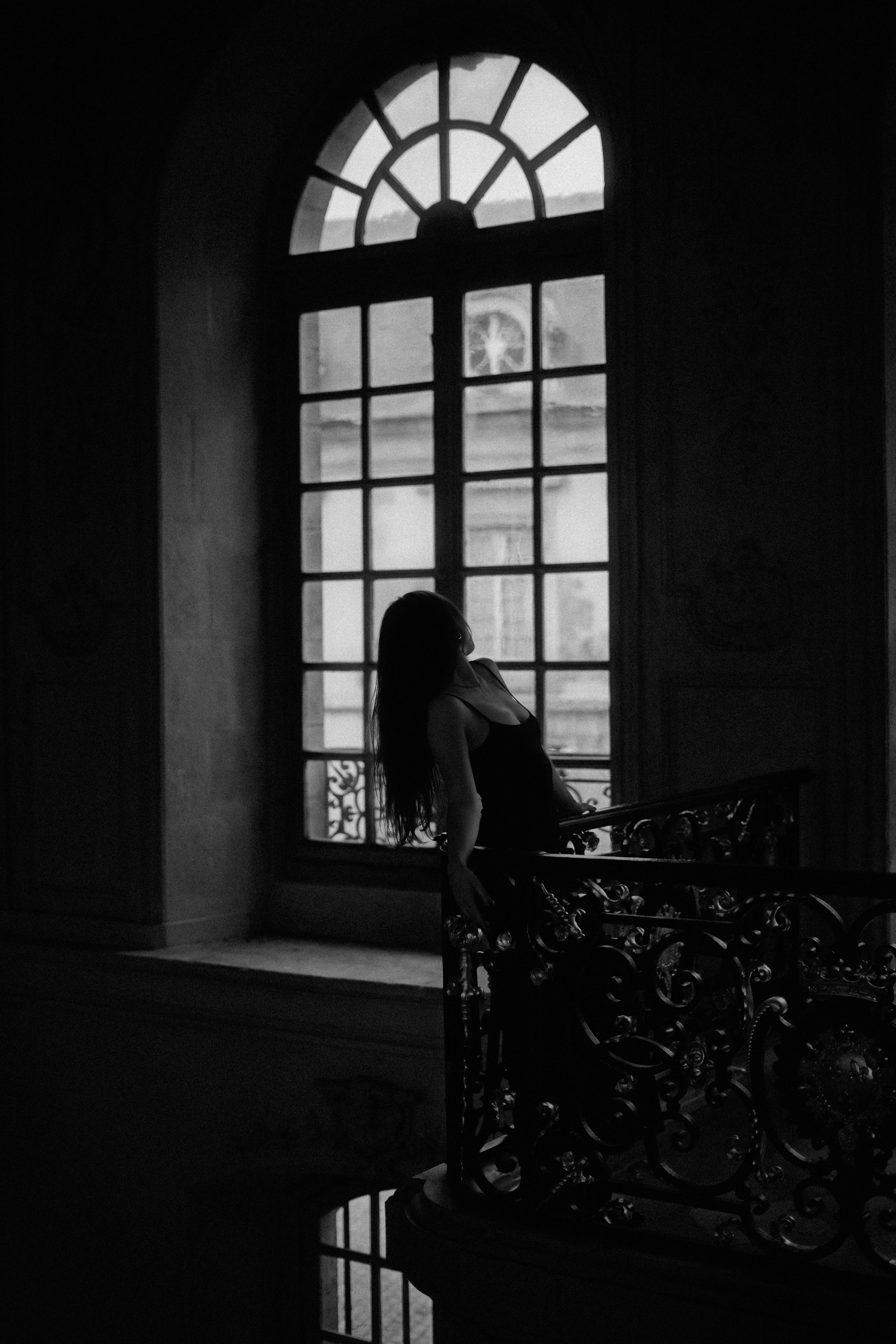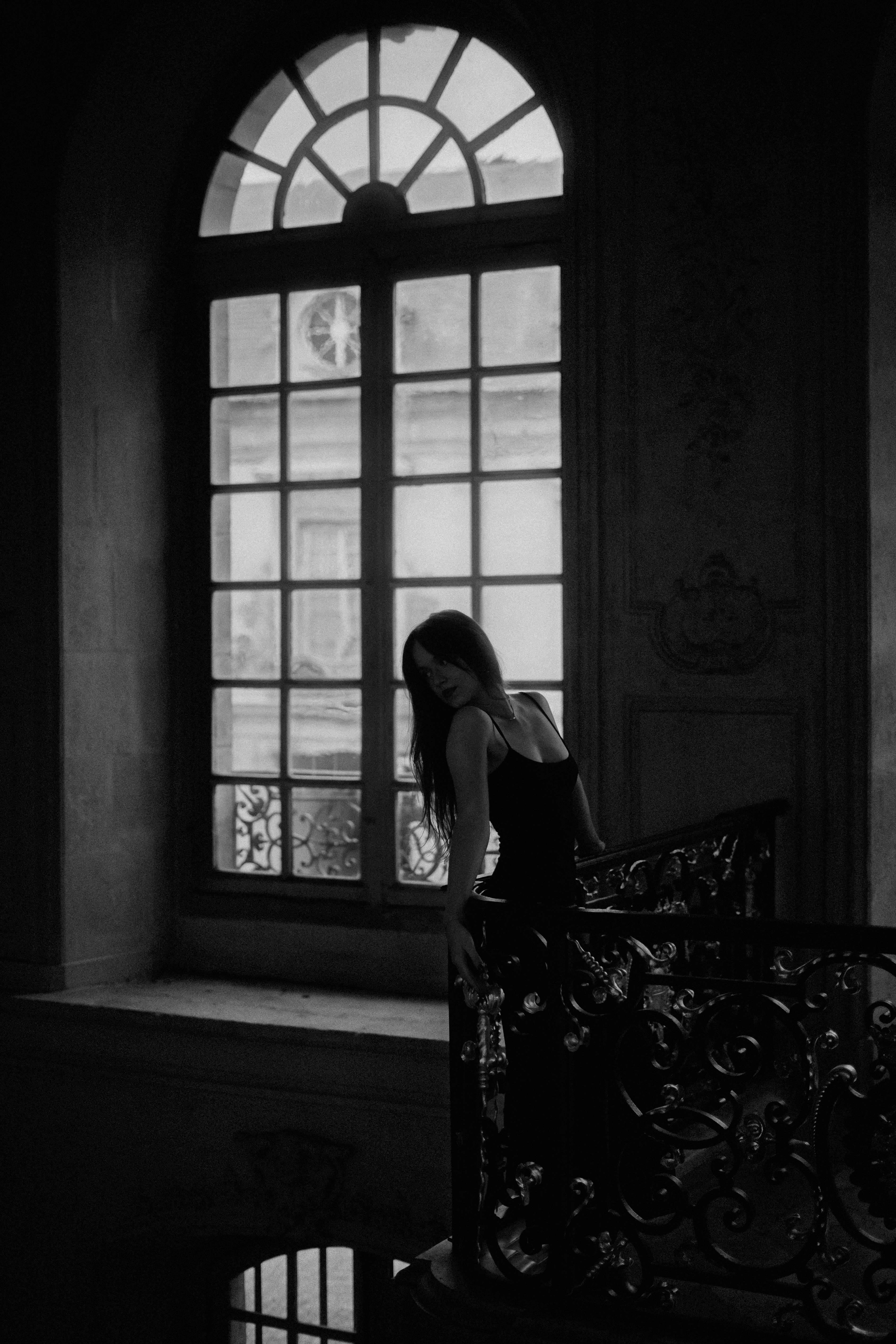 Elle glisse entre les ombres, silhouette fluide capturée entre le poids du passé et l’évanescence du présent. Chaque marche qu’elle frôle semble porter l’écho d’histoires murmurées, de promesses oubliées. La lumière, rare et douce, caresse les contours de son mystère, tandis que l’obscurité l’enlace comme un secret bien gardé. Entre la pierre et le fer forgé, elle est un instant suspendu, une énigme que l’on contemple sans jamais tout à fait saisir.