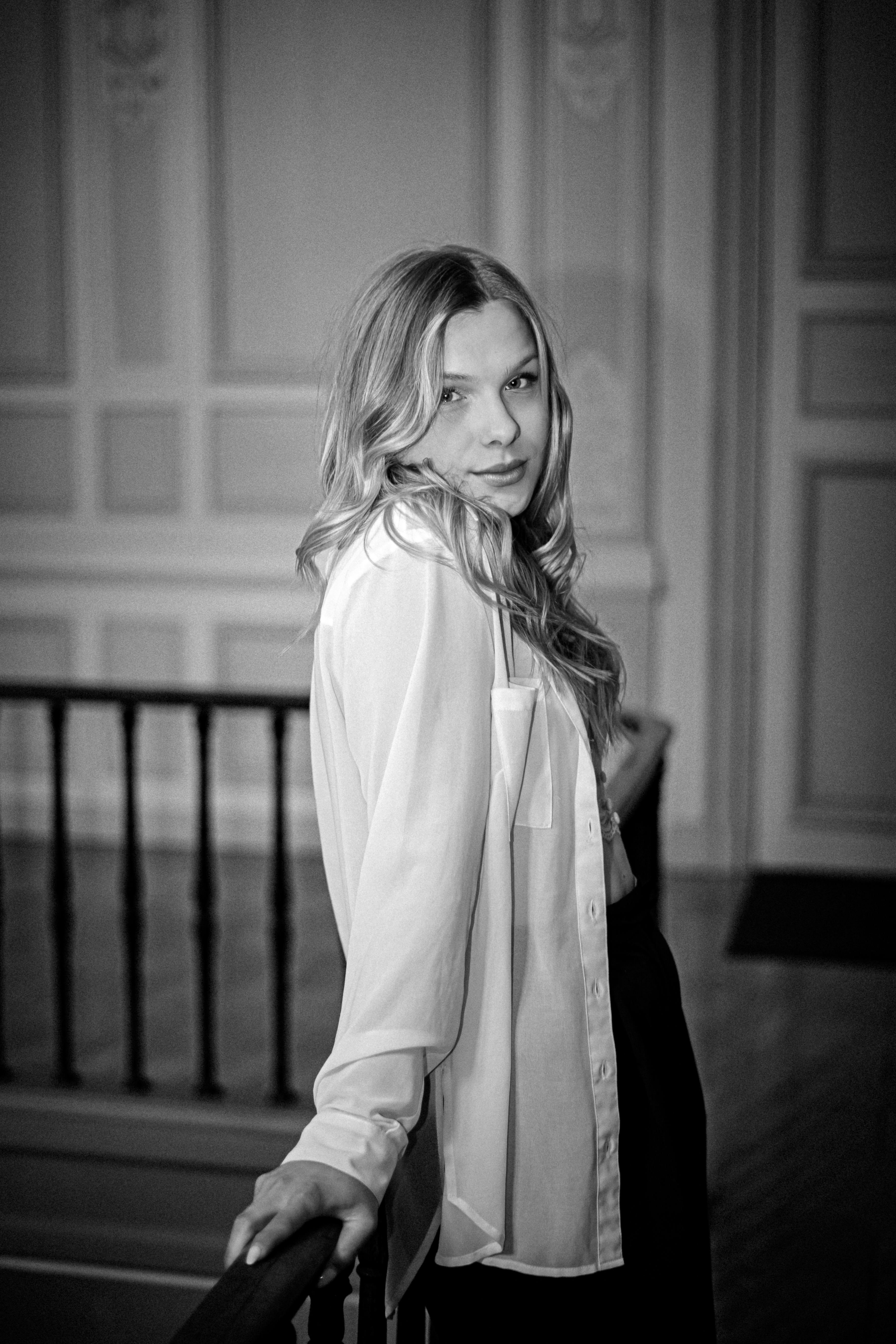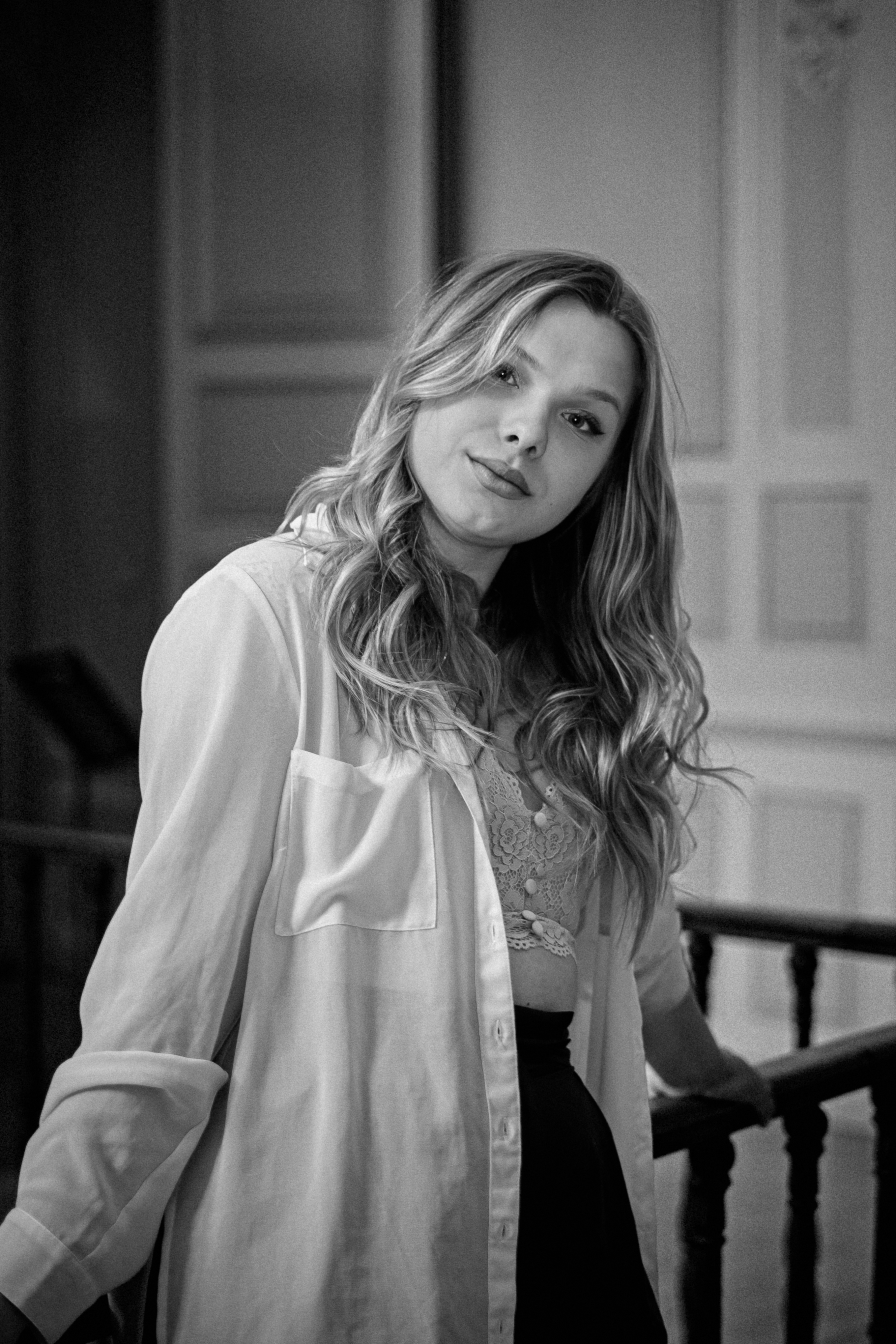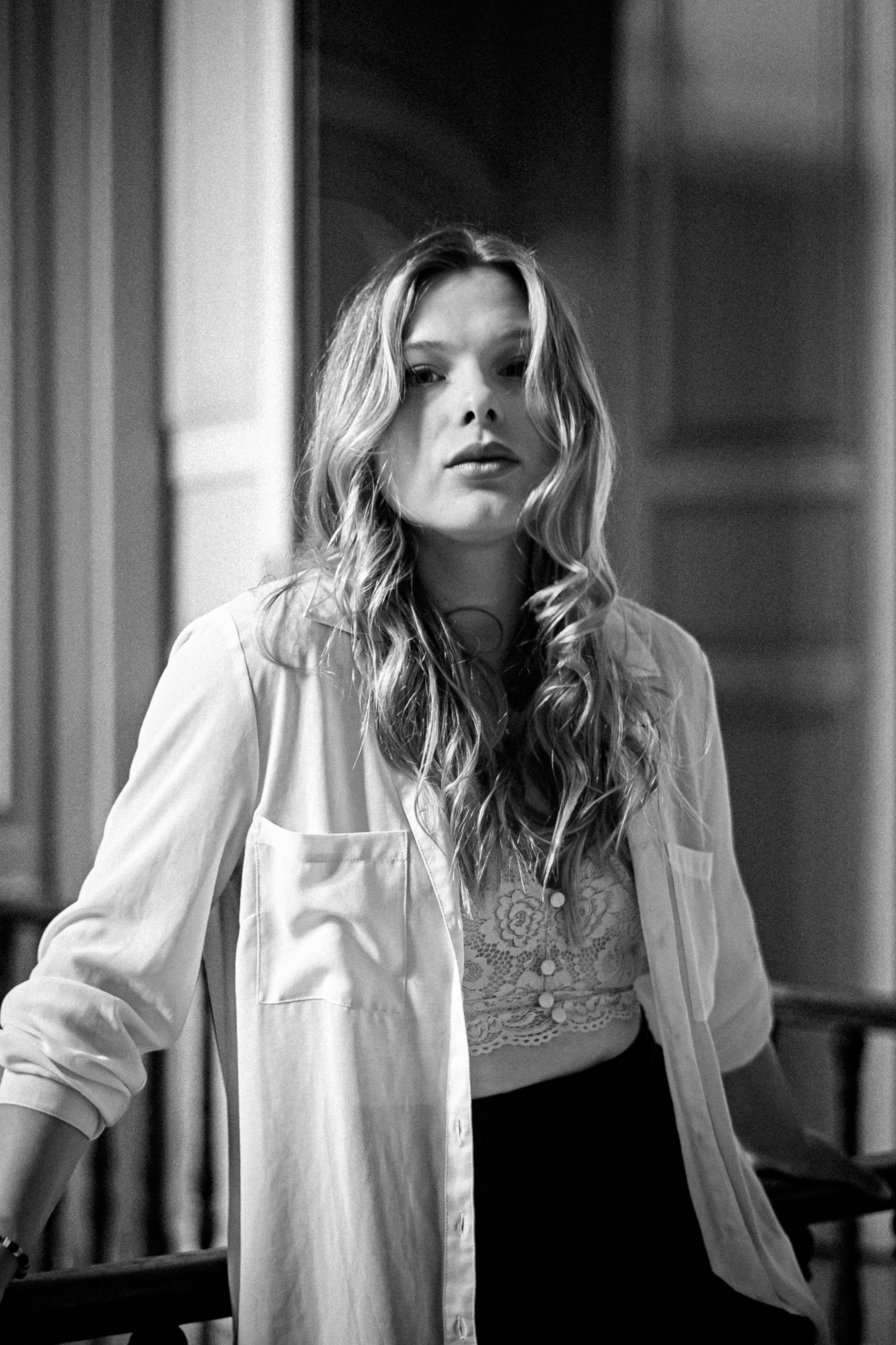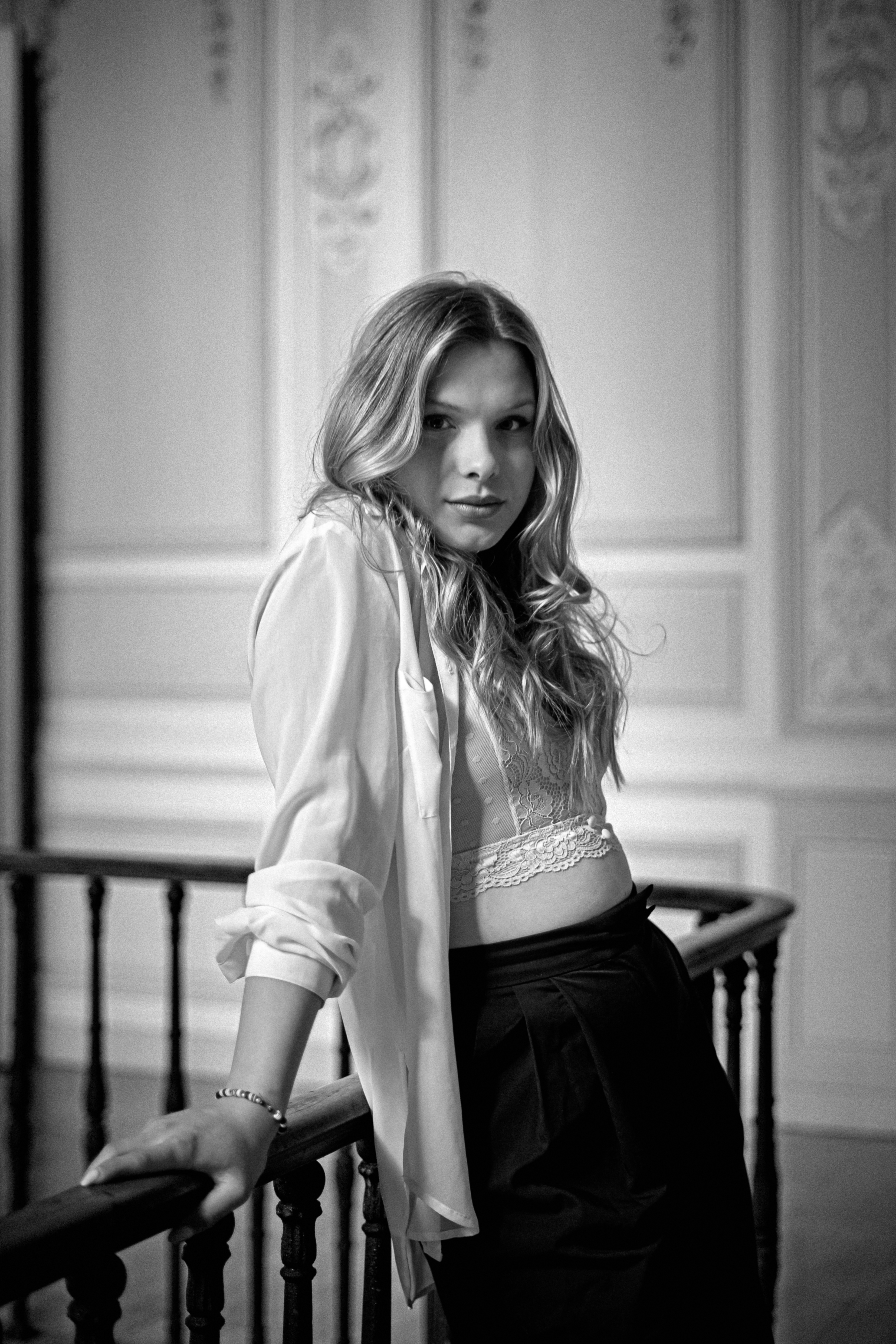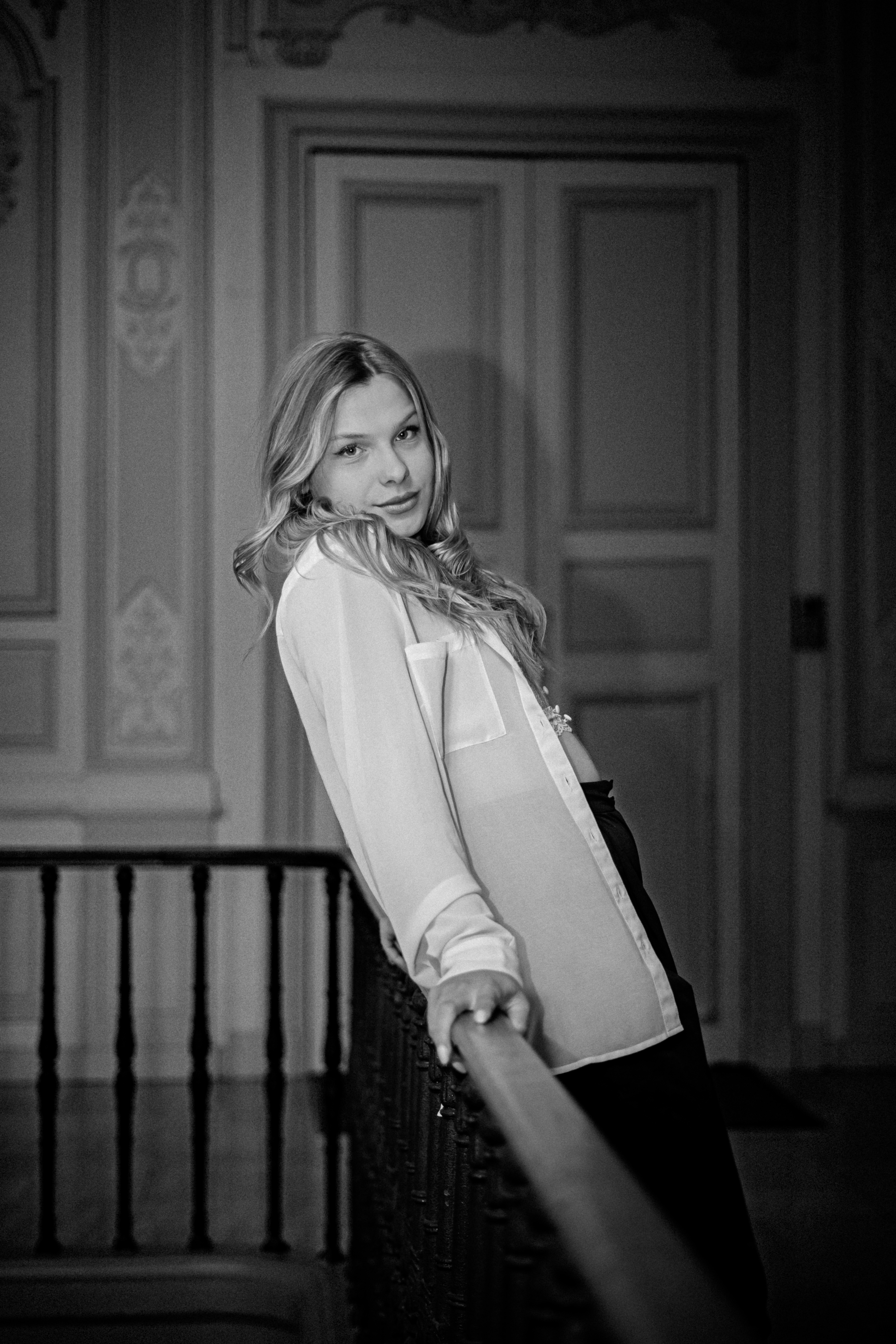 Elle se penche doucement, comme si le murmure du bois sous sa main lui soufflait un secret. Le regard ancré, mais l’âme en suspens, elle habite l’instant avec cette grâce tranquille que seuls les lieux anciens semblent savoir révéler. Dans les plis de sa chemise, la lumière s’infiltre — discrète, presque timide — rappelant que parfois, l’élégance se niche dans ce qui ne fait pas de bruit.